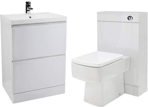 Tribute vanity unit in white with drawers, basin, back to wall unit, toilet pan, concealed cistern and seat.