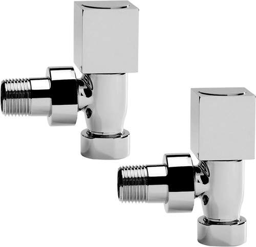 Pair of angled radiator valves in chrome with square handles. Hudson Reed guarantee this valve pack for 20 years.