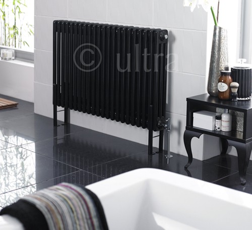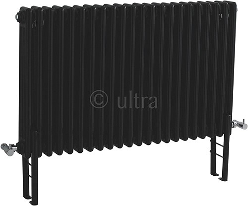 Triple column radiator in high gloss black with legs. 7565 BTUs.