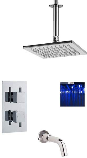 Thermostatic twin concealed shower valve set in chrome with square 200x200mm LED shower head, ceiling mounting arm and bath spout.