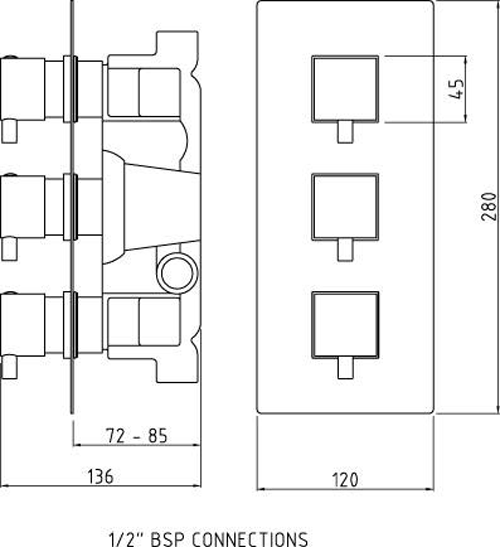 Thermostatic triple concealed shower valve set in chrome with diverter, square 200x200mm LED shower head, wall mounting arm, slide rail kit and bath filler spout.