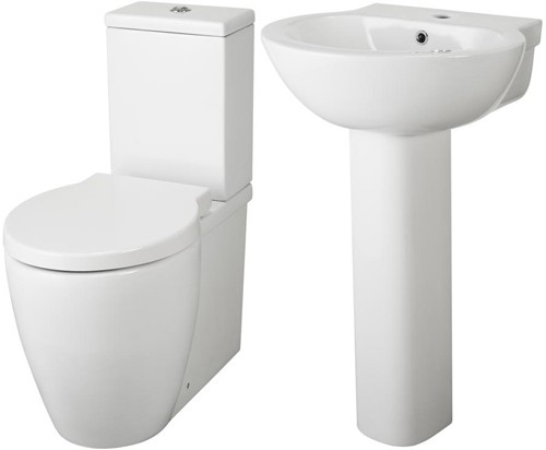 Langdon II four piece bathroom suite with flush to wall toilet pan, soft close seat, push flush cistern, basin and full pedestal.