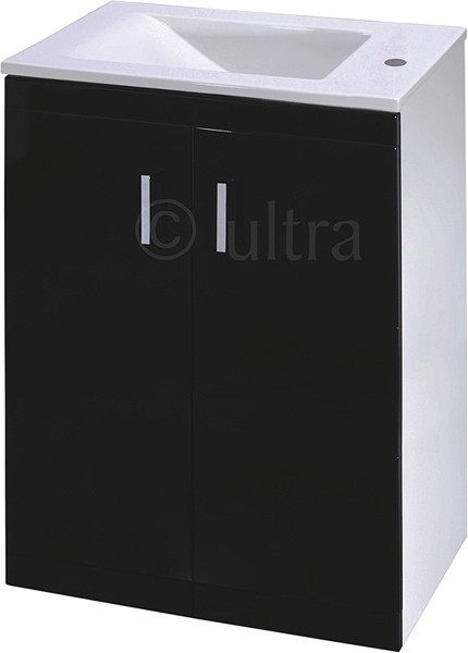 Floor standing vanity unit in black with built in cupboard and reversible 1 tap hole ceramic basin. Size 550W x 800H x 330D mm.