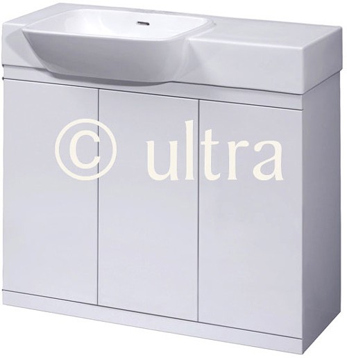 Floor standing vanity unit in white with built in cupboard and 1 tap hole ceramic basin. Size 900W x 695H x 500D mm.