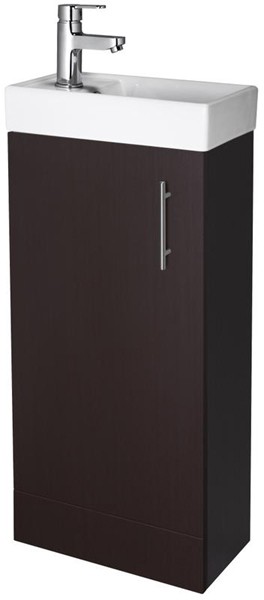 Minimalist Compact floor standing vanity unit in ebony with chrome handle and ceramic basin.