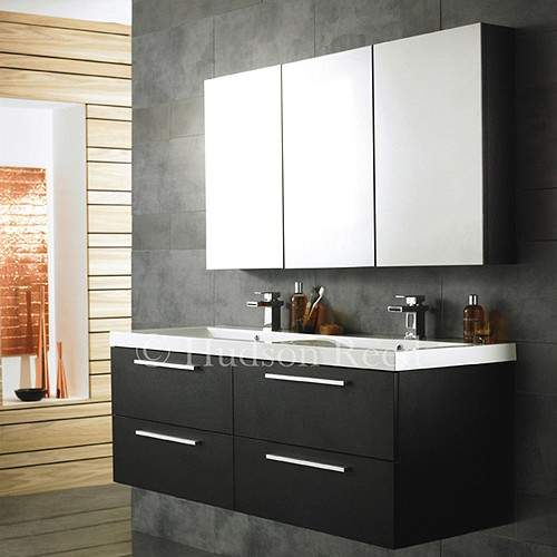 Wall hung bathroom furniture set in black with vanity unit, double basin and 3 door mirror bathroom cabinet.