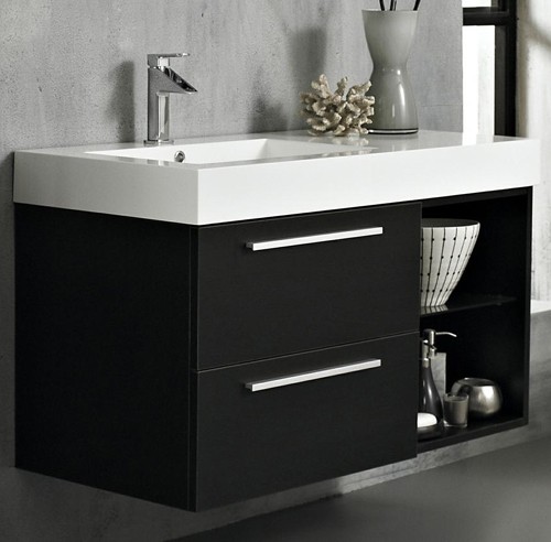 Console 1000mm wall hung vanity unit in wenge with drawers and basin.