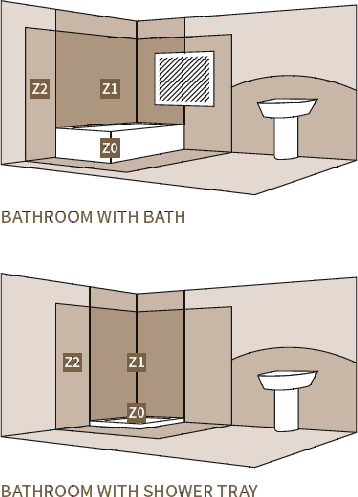 Safety is the main concern when considering bathroom lighting. Bathrooms are divided into ZONES 0 , 1 and 2 , based on their likely exposure to water. Only use light fittings in the zone for which they are designed. The main light should be switched on by a pull cord or switch outside the bathroom. The window recess is classed as ZONE 1.