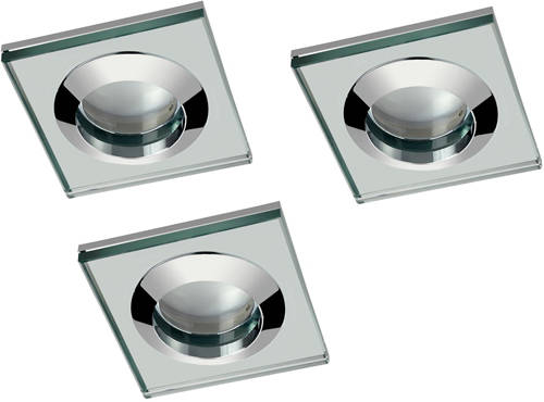 3 x Square spot light fittings in glass and chrome (240v) with warm white LED lamps (GU10).