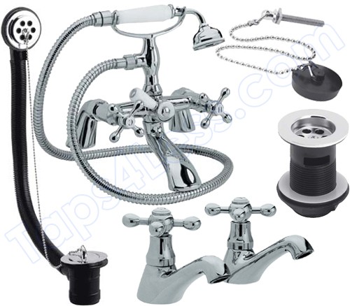 Mixer pack with bath shower mixer (large handset), basin taps and wastes.