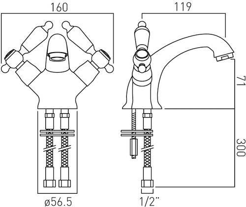 - Basin tap connections: 2 x 1/2" (nut) x 300 mm flexipipe connections.