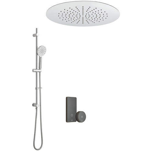 Vado Sensori SmartTouch shower in black with two outlets, colour LED display, wireless remote control, 380mm ceiling mounted round shower head and slide rail kit.