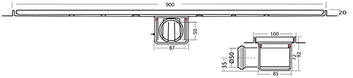 Van Den Berg standard rectangular shower channel drain in stainless steel with perforation round grating (900x100mm).